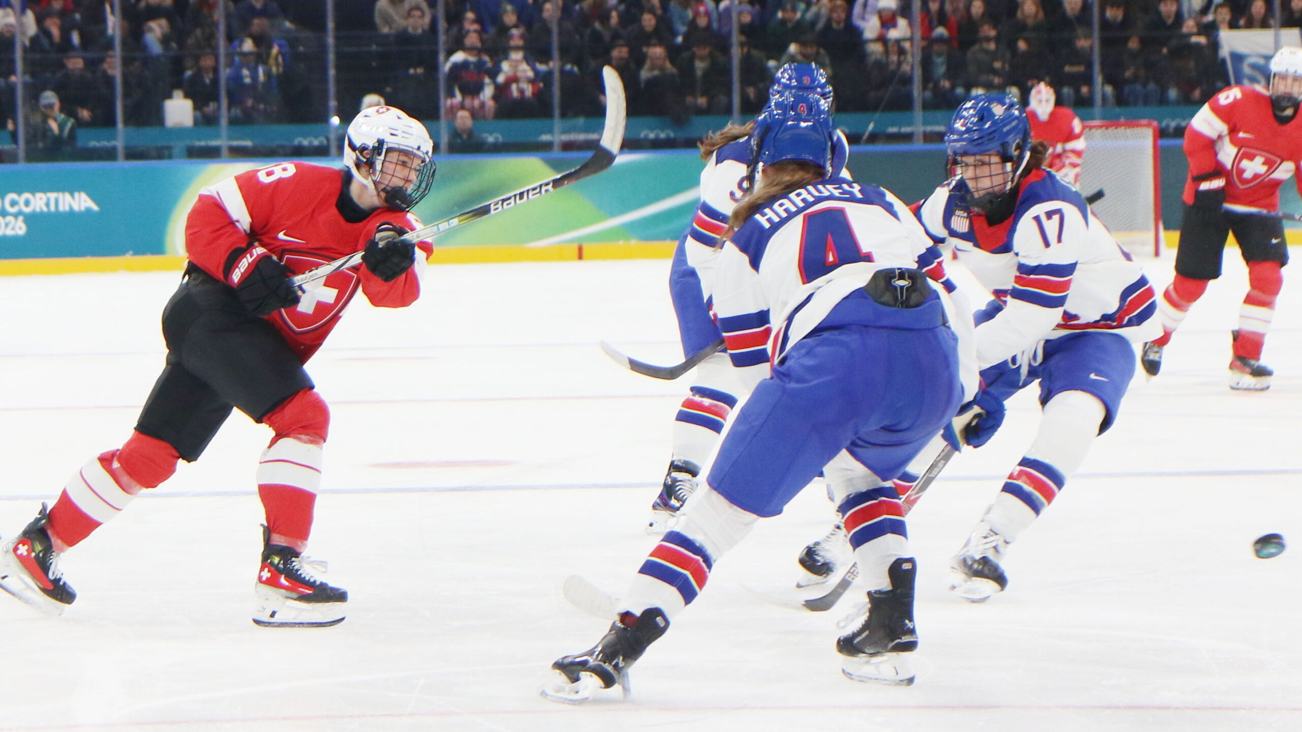 Leoni Balzer #68, Caroline Harvey #4, Britta Curl #17, Kirsten Simms #9, Olympic Games 2026 Womens Hockey SUI – USA, Santagiulia Arena, Milano , © Puckfans.at / Andreas Robanser