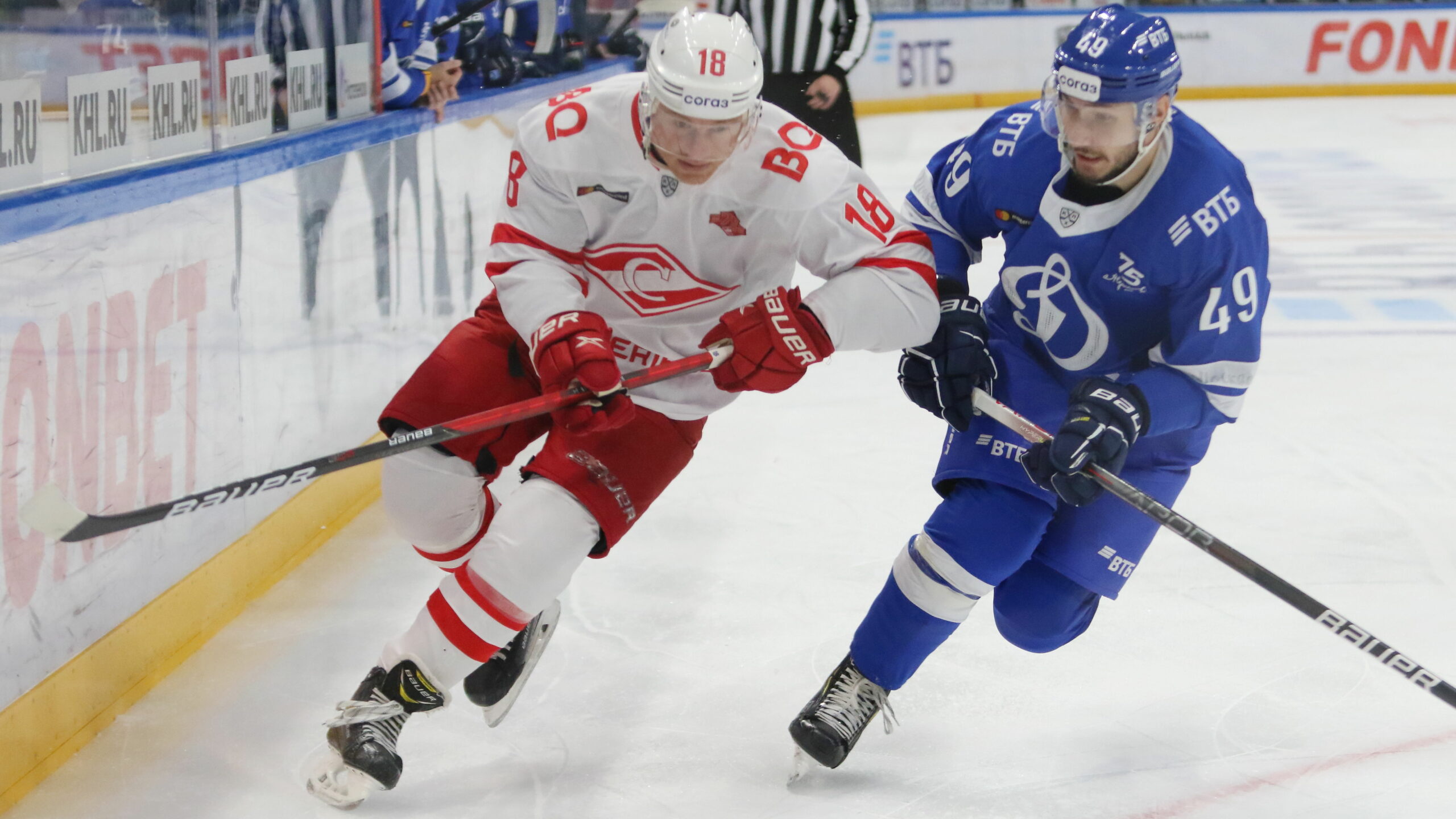 6T4A5904 28. September 2021 2560 × 1440 Dynamo gewinnt spektakuläres Derby gegen Spartak Dynamo Moscow – Spartak Moscow Dmitri Kugryshev #18, Artyom Volkov #49 VTB Arena, Moscow © Puckfans.at/Andreas Robanser