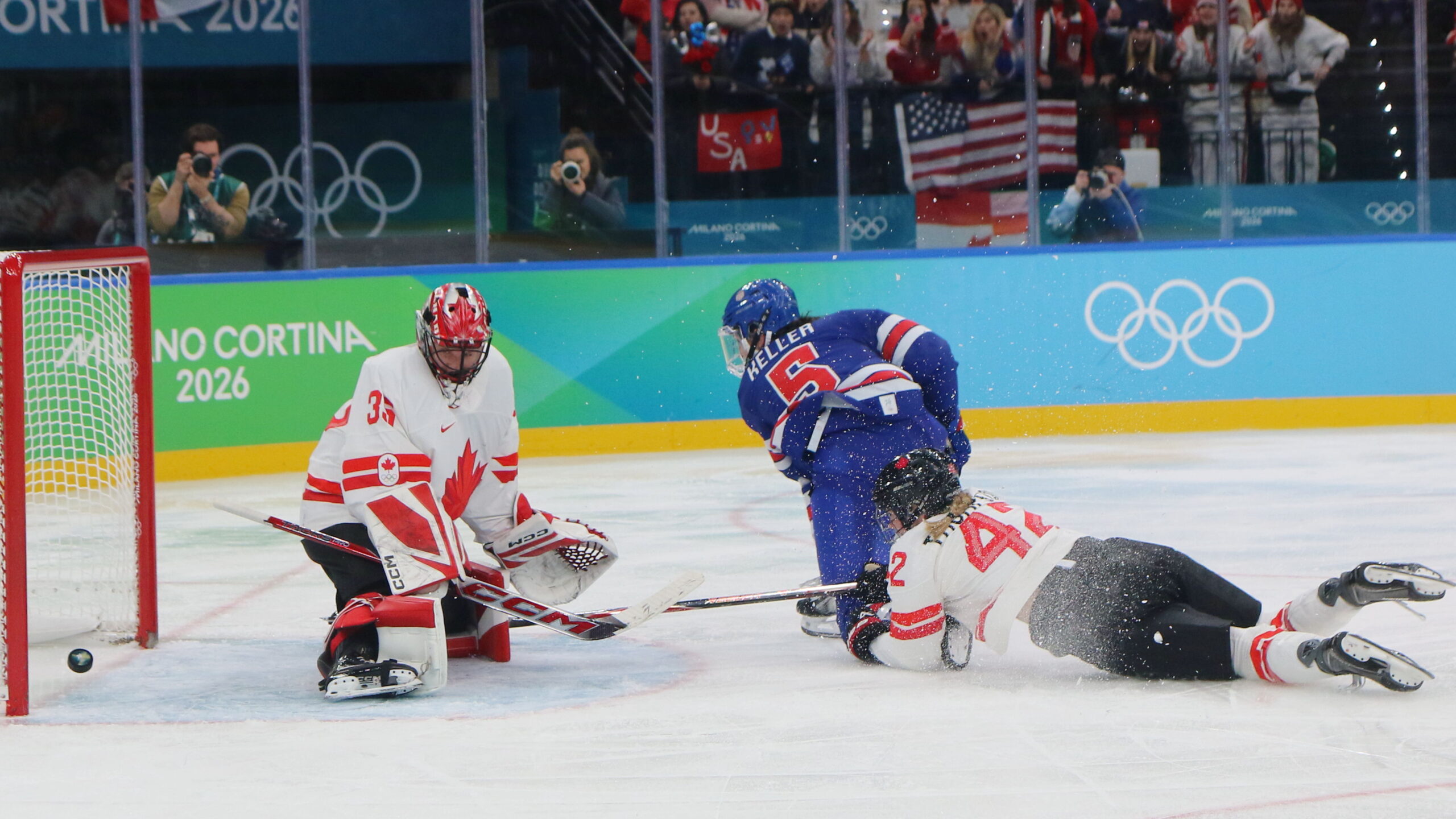 Ann-Renée Desbiens #35, Megan Keller #5, Claire Thompson #42, Olympic Games 2026 WomensGold Medal Game USA – CAN, Milano Santa Giulia Arena, © Puckfans.at / Andreas Robanser