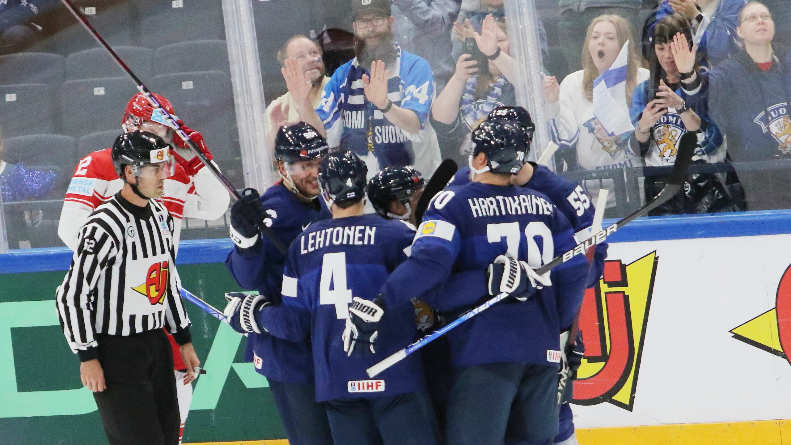 6T4A0054 23. Mai 2023 2560 × 1440 Finnland beendet Gruppenphase mit Kantersieg IIHF World Championship 2023 FIN – DEN Oscar Fisker Mølgaard #12, Mikko Lehtonen #4, Mikko Rantanen #96, Teemu Hartikainen #70, Atte Ohtamaa #55 Nokia Arena, Tampere © Puckfans.at / Andreas Robanser