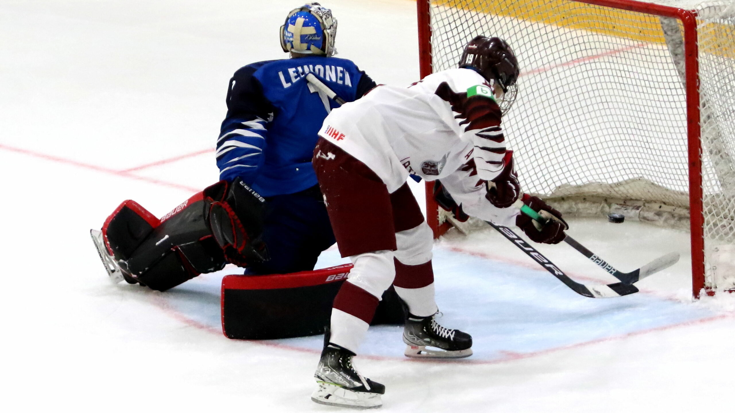 6T4A0560 24. April 2022 2560 × 1440 Finnland erneut ohne Probleme U18 IIHF World Championship FIN – LAT Topias Leinonen #1, Dans Locmelis #19 Erdgas Schwaben Arena, Kaufbeuren © Puckfans.at/Andreas Robanser