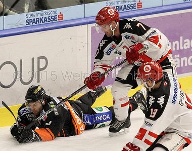 26. Oktober 2015 380 × 298 Graz 99ers – HC InnsbruckPeter MACARTHUR (Graz 99ers), Dustin VANBALLEGOOIE (Innsbruck) & Tyler SPURGEON (Innsbruck)©Krainbucher Werner/Puckfans.at