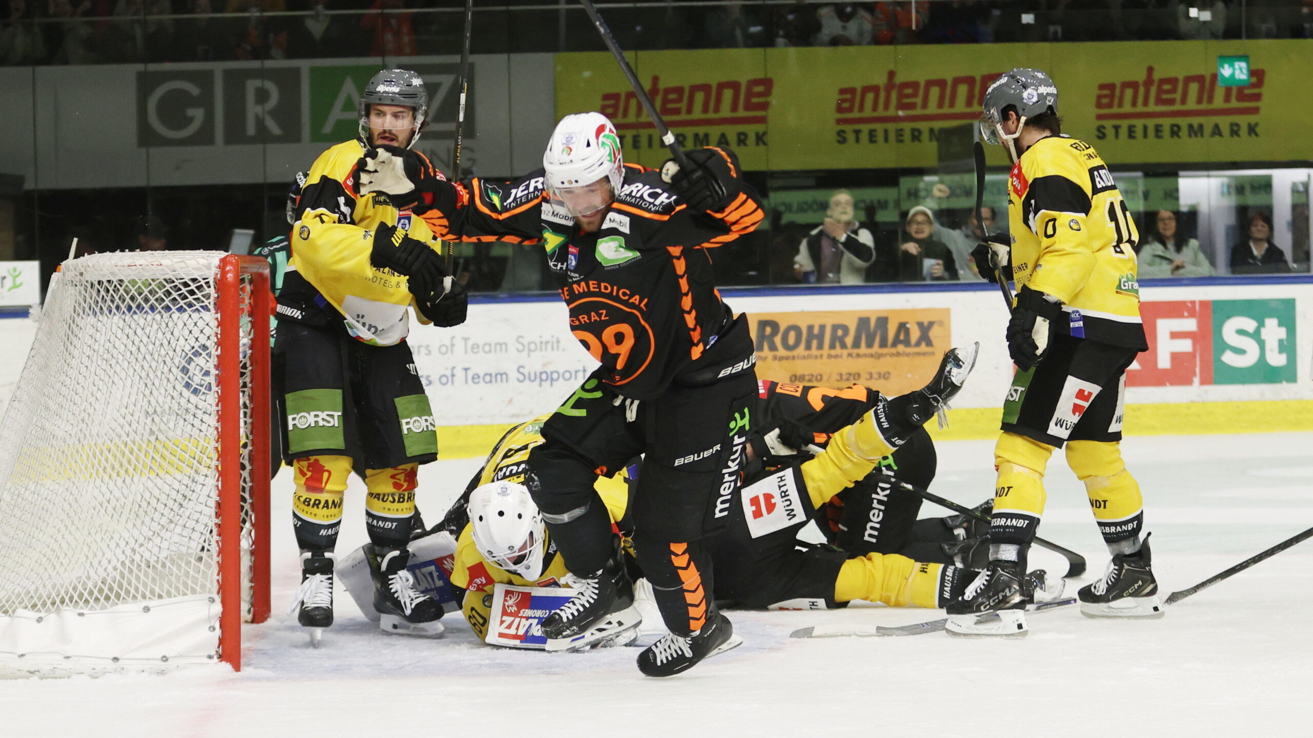 Josh Currie #64, Eddie Pasquale #80, Cole Bardreau #10, ICEHL Final Game 1 Graz99ers – HC Pustertal, Merkur Eisstadion, © Puckfans.at / Andreas Robanser