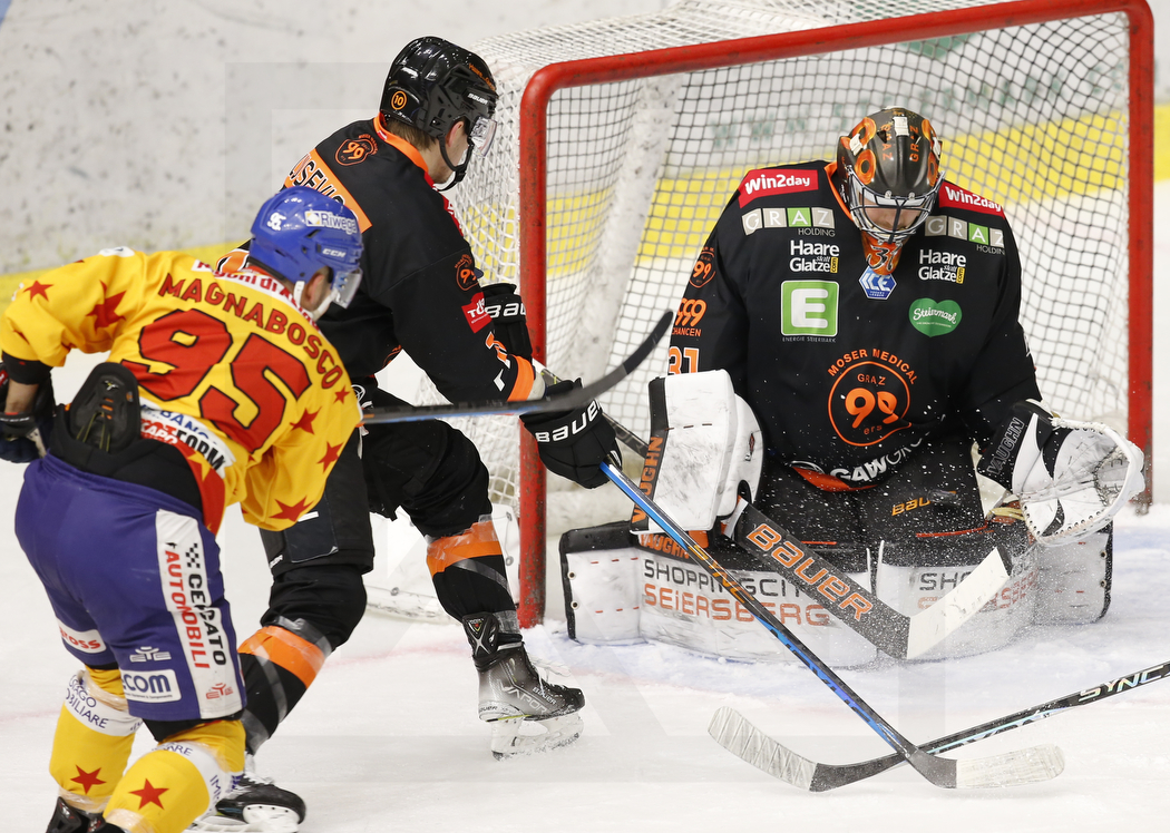 GRAZ, AUSTRIA, 20.Dec. 2022 – Moser Medical Graz 99ers vs. Migross Supermercati Asiago. Image shows Marco Jose MAGNABOSCO AGUIRRE #95 (Migross Supermercati Asiago), gg10 & Christian ENGSTRAND #31 (Moser Medical Graz 99ers). Photo: Werner Krainbucher