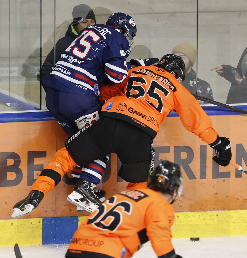 WK20230101_0131 1. Januar 2023 1008 × 1050 ICEHL PHOTO GALLERY: GRAZ99ERS – FEHERVAR 3:1 GRAZ, AUSTRIA, 01.Jan. 2023 – Moser Medical Graz 99ers vs. Hydro Fehervar AV 19. Image shows Guillaume LECLERC #45 (Hydro Fehervar AV 19) & Michael KERNBERGER #65 (Moser Medical Graz 99ers). Photo: Werner Krainbucher
