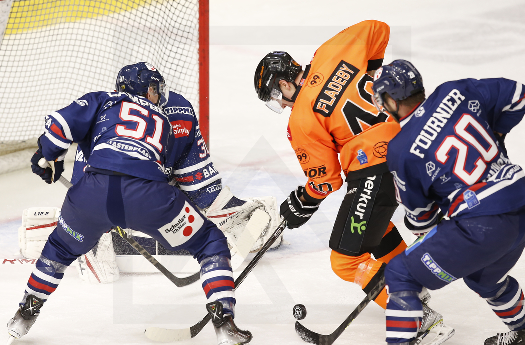 GRAZ, AUSTRIA, 01.Jan. 2023 – Moser Medical Graz 99ers vs. Hydro Fehervar AV 19. Image shows Timothy CAMPBELL #51 (Hydro Fehervar AV 19), Olivier ROY #30 (Hydro Fehervar AV 19), Tobias FLADEBY #40 (Moser Medical Graz 99ers) & Gleason FOURNIER #20 (Hydro Fehervar AV 19). Photo: Werner Krainbucher