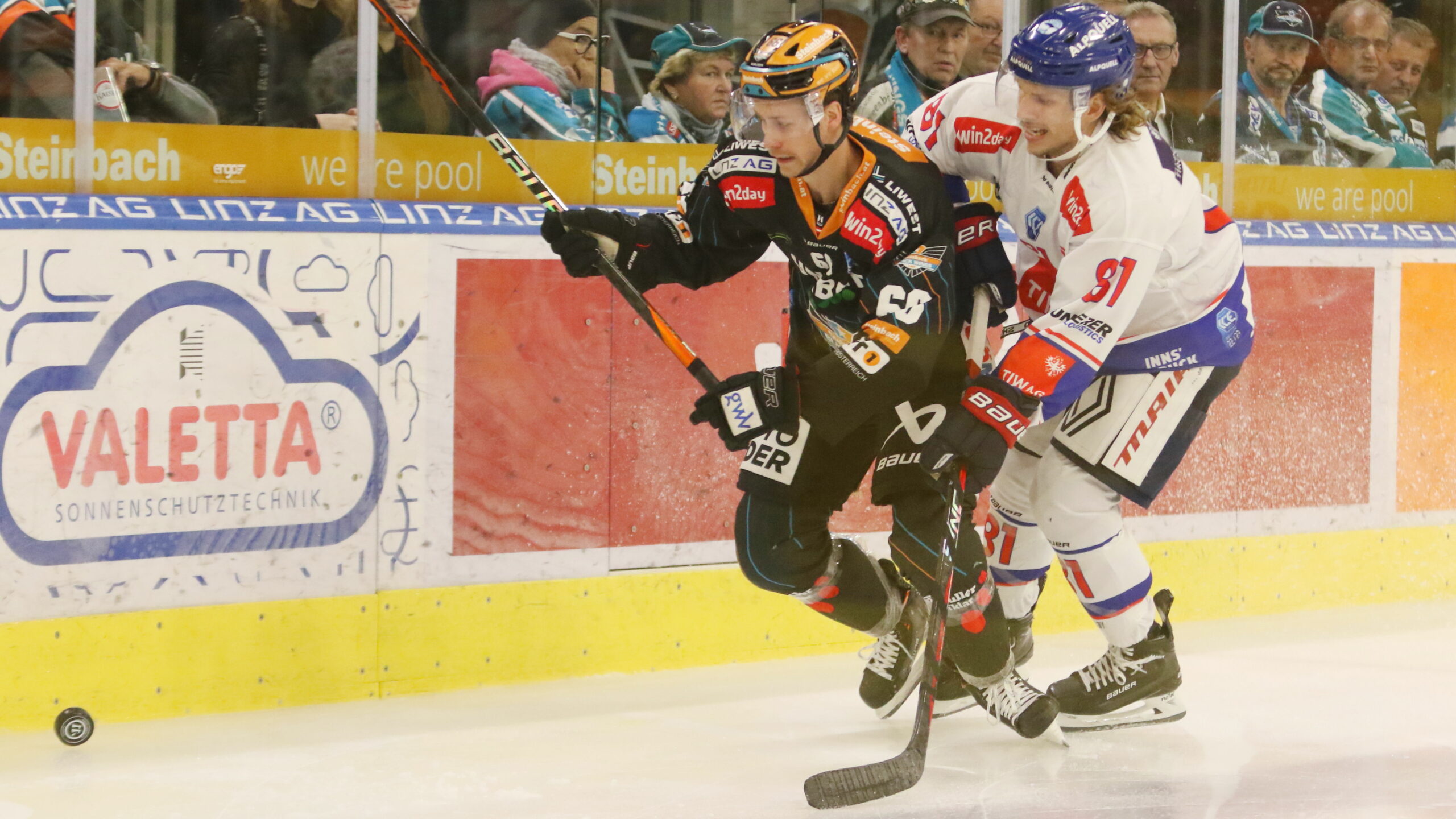 6T4A1110 18. Oktober 2022 2560 × 1440 ICEHL Round 9: Black Wings Linz – HC Innsbruck 4:1 ICEHL: Black Wings Linz – HC Innsbruck Stefan Gaffal #66, Corey Mackin #81 Linz AG Eisarena, © Puckfans.at/Andreas Robanser