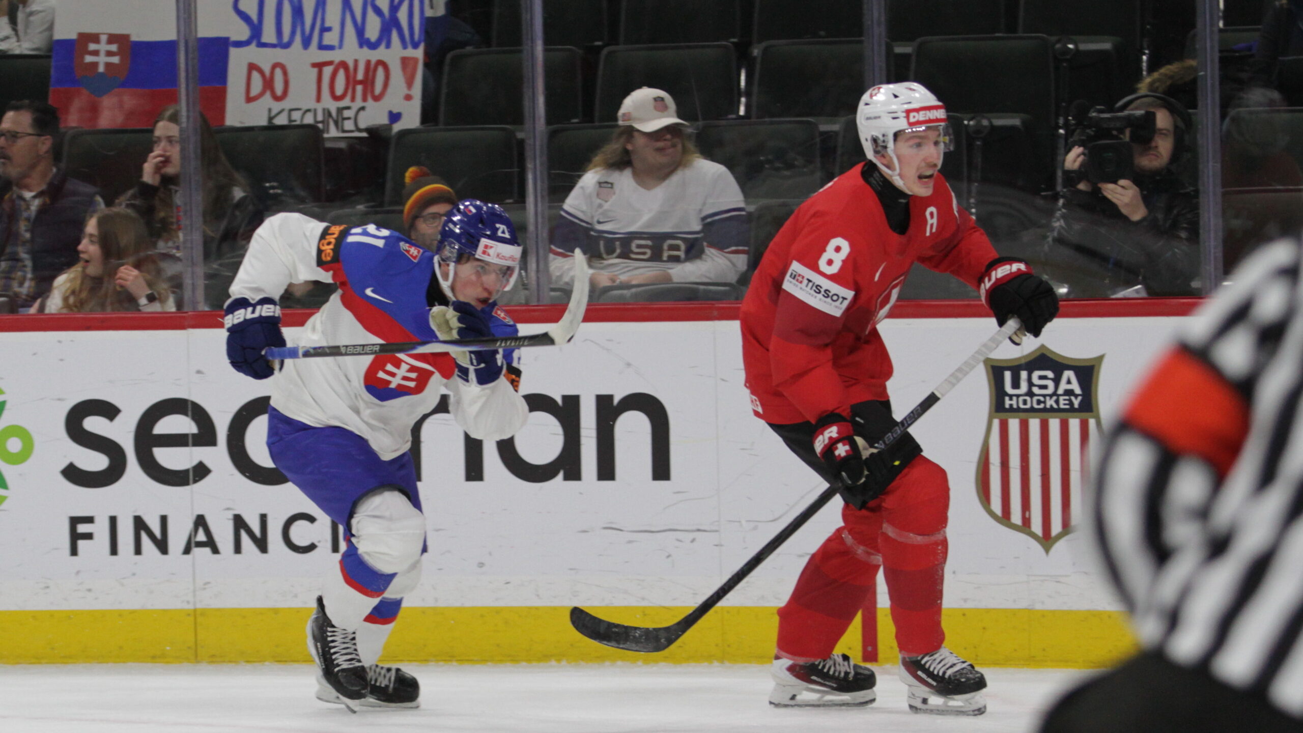 Adam Nemec #21, Gian Meier #8, World Juniors 2026 SUI – SVK, Grand Casino Arena, Saint Paul © Puckfans.at / Andreas Robanser