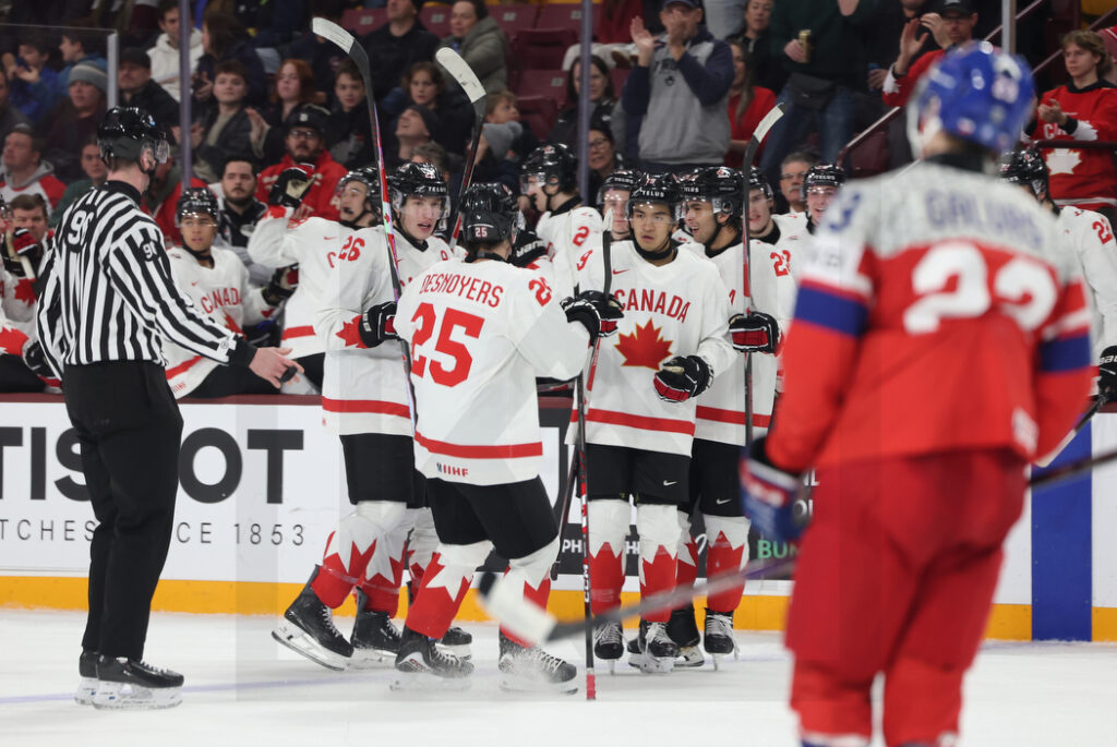 Nach drei Minuten im Schlussabschnitt dann wieder ein Überzahl für Kanada wobei Parekh ein weiteres Mal nicht von der Scheibe zu trennen war und sehenswert Team Canada wieder in Front brachte doch Tschechien antwortete durch Tomas Poletin postwendend. Doch auch Kanada reagierte rasch und Tij Iginla traf in der 47.Minute dank eines abgefälschten Schuss zur 5:4 Führung. In der 50.Minute brachten die Tschechen den Puck nicht aus ihrer Gefahrenzone und dies nutzte Ethan MacKenzie zur erstmaligen zwei Tore Führung. Die Tschechen vergaben etwas später ein Überzahl. Ein Fehler von Iginla sorgte viereinhalb Minuten vor der Pause durch Tomas Galvas zumindest einmal zum Anschlusstreffer. Die Tschechen holten nach kurzen Abwarten ihren Goalie vom Eis doch nur sieben Sekunden später beförderte Porter Martone den Puck ins leere Tor zum 7:5 Sieg.