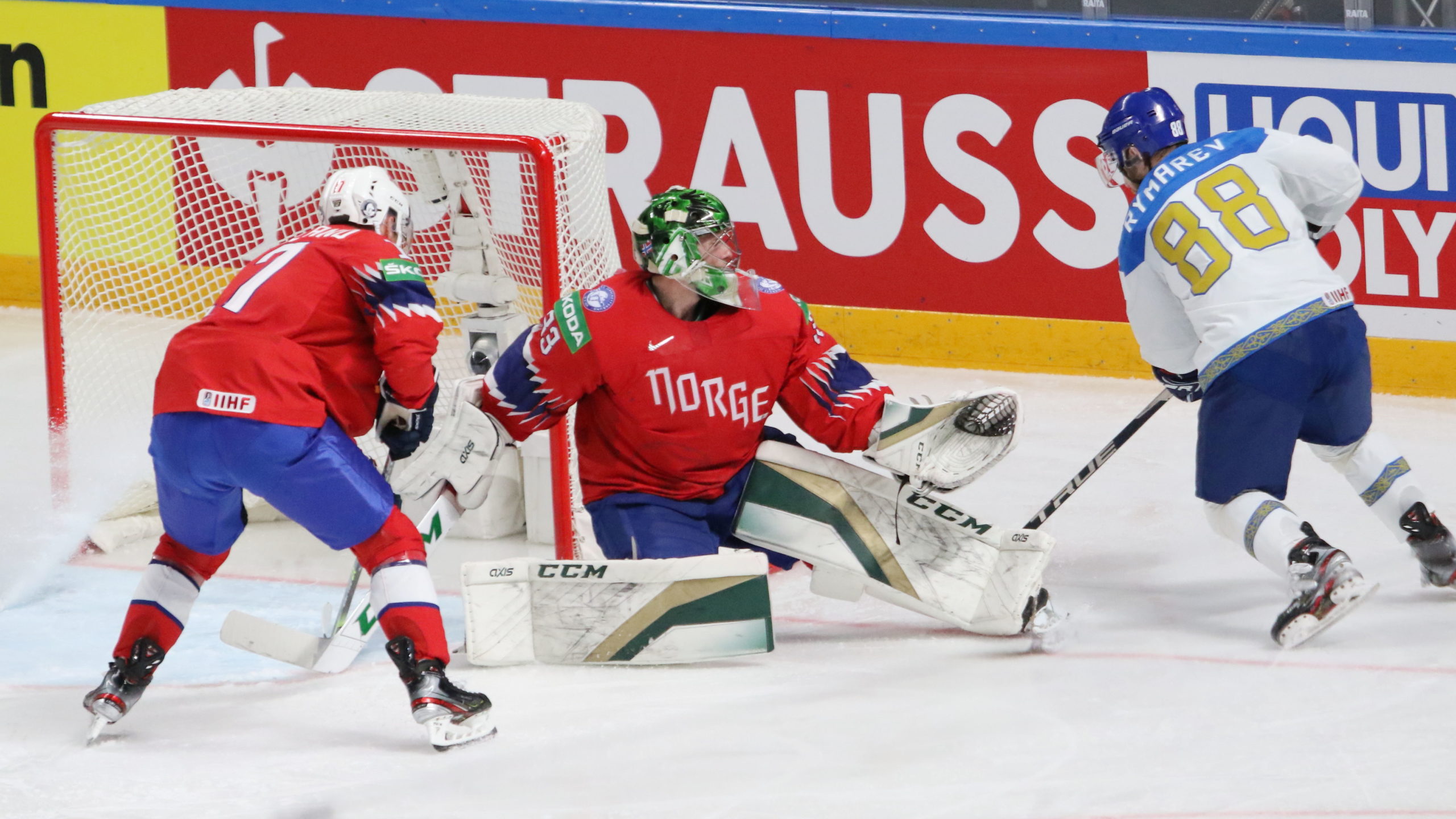 pfIMG_0047 31. Mai 2021 2560 × 1440 Kasachstan verliert entscheidendes Spiel IIHF World Championship 2021 NOR – KAZ Henrik Haukeland #33, Yevgeni Rymarev #88 Arena Riga © Puckfans.at/Andreas Robanser