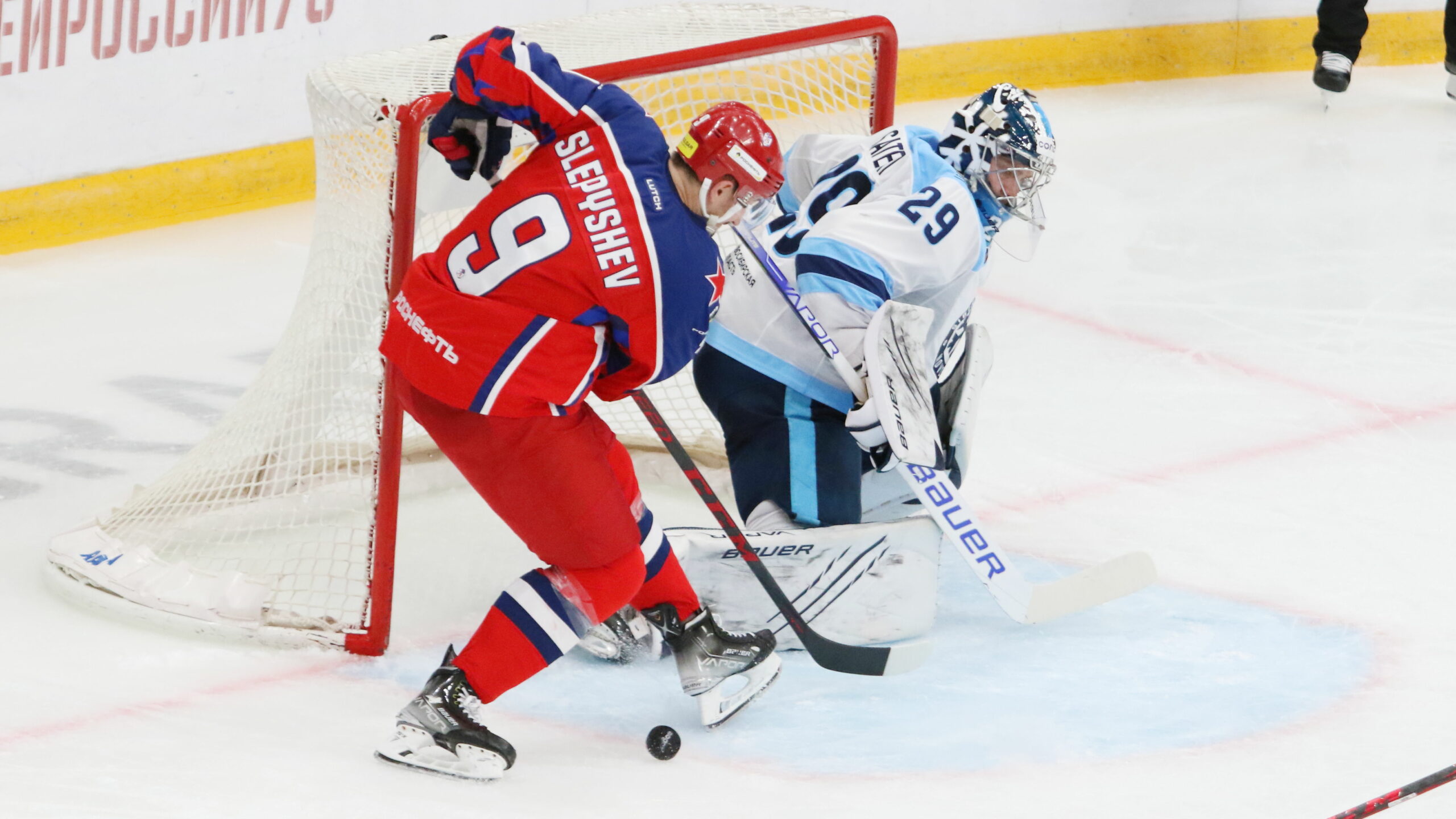6T4A6869 29. September 2021 2560 × 1440 KHL Photo Gallery CSKA Moscow – Sibir Novosibirsk 1:0 OT CSKA Moscow – Sibir Novosibirsk Anton Slepyshev #9, Harri Sateri #29 CSKA Arena, Moscow © Puckfans.at/Andreas Robanser