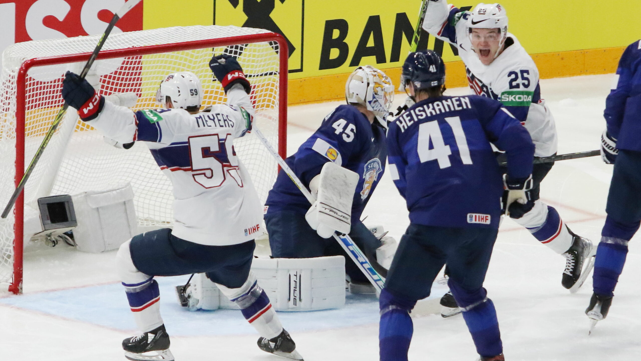 6T4A2747 28. Mai 2022 2560 × 1440 Kommt es Morgen zu Jalonischen Festspielen? IIHF Ice Hockey World Championship 2022, Semifinal FIN – USA Ben Meyers #59, Juho Olkinuora #45, Miro Heiskanen #41, Karson Kuhlman #25 Nokia Arena, Tampere © Puckfans.at/Andreas Robanser