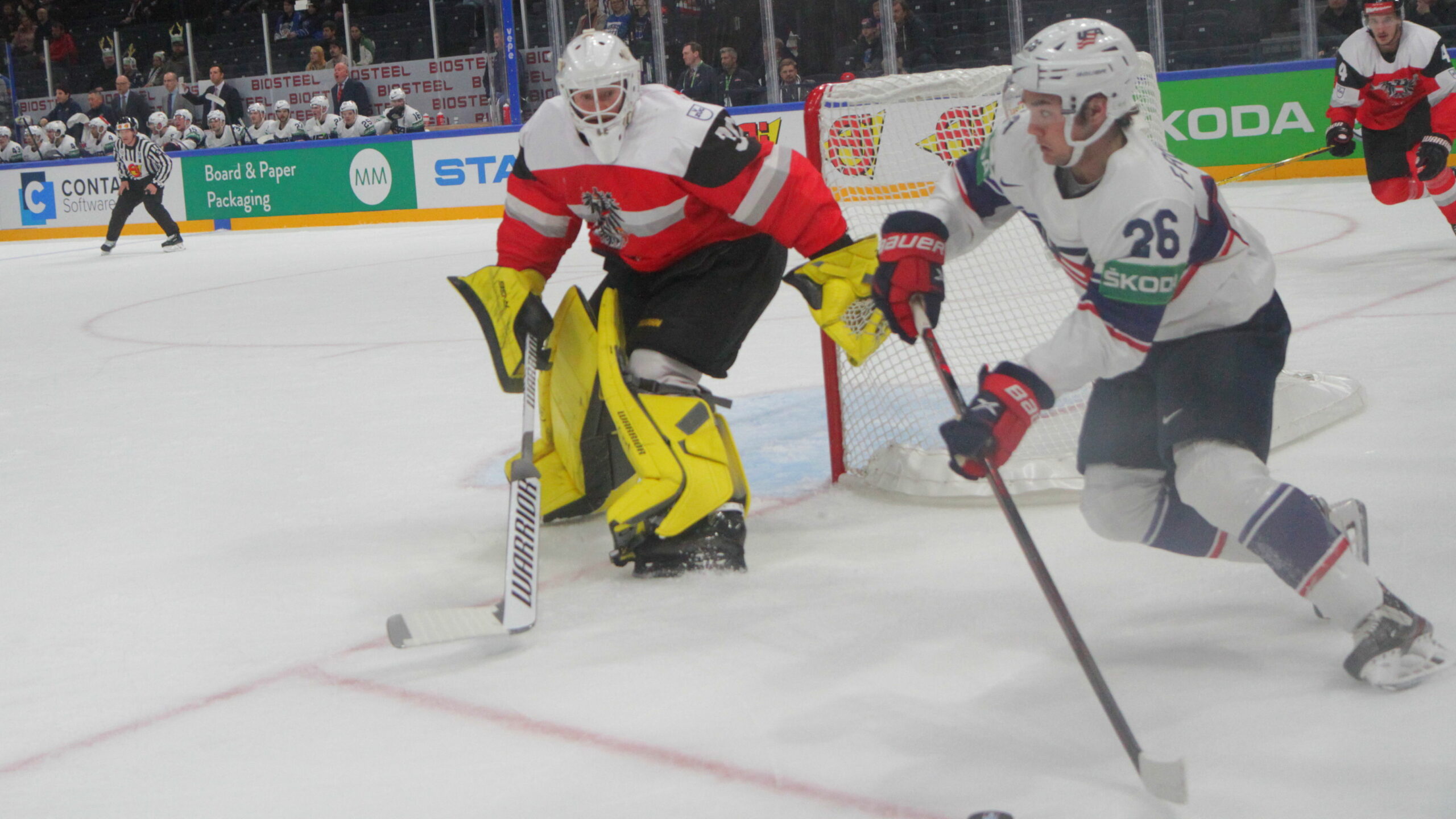 IMG_0433 15. Mai 2022 2560 × 1440 Krone richten und weitergeht es IIHF Ice Hockey World Championship AUT – USA David Kickert #30, Sean Farrell #26 Nokia Arena, Tampere © Puckfans.at/Andreas Robanser