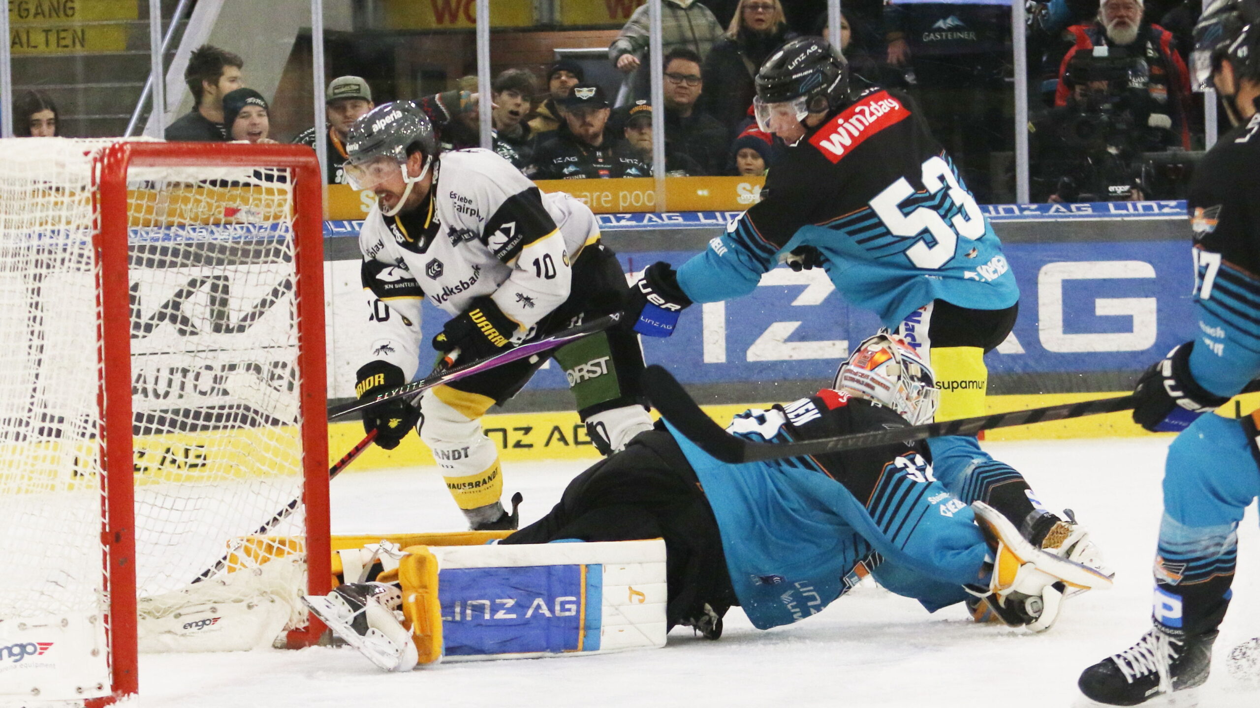 6T4A1253 6. Dezember 2025 2560 × 1440 Linz gewinnt erneut das Heimspiel gegen Bruneck Cole Bardreau #10, Paul Eder #53, Rasmus Tirronen #32, ICEHL Round 28 Black Wings Linz – HC Pustertal, Linz AG Eisarena, © Puckfans.at / Andreas Robanser