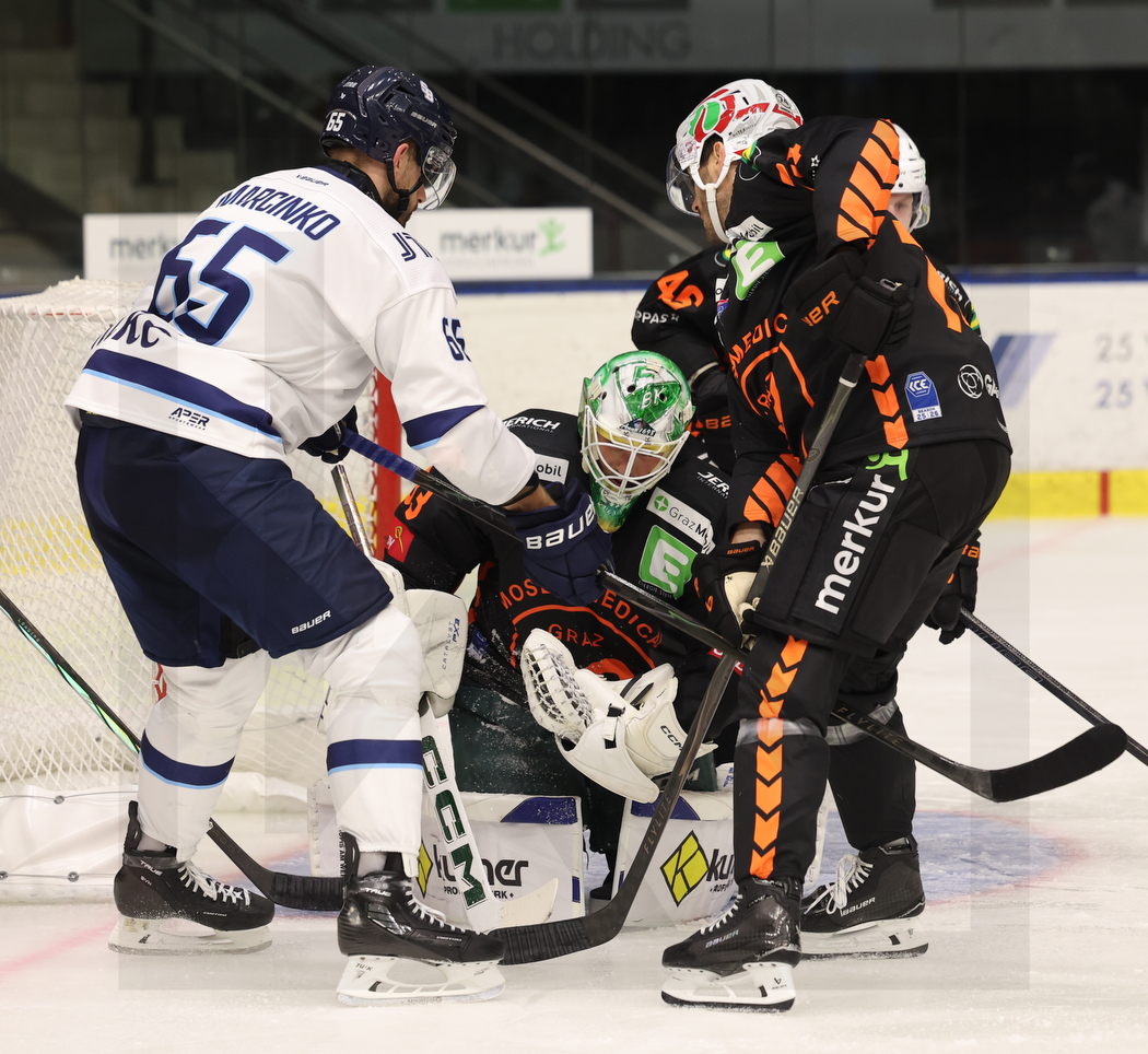 GRAZ, AUSTRIA, 22, Aug, 2025, Moser Medical Graz 99ers vs. HC Slovan Bratislava. Image shows Tomas MARCINKO #65 (HC Slovan Bratislava) & Maxime LEGACE #33 (Moser Medical Graz 99ers). Photo: Werner Krainbucher