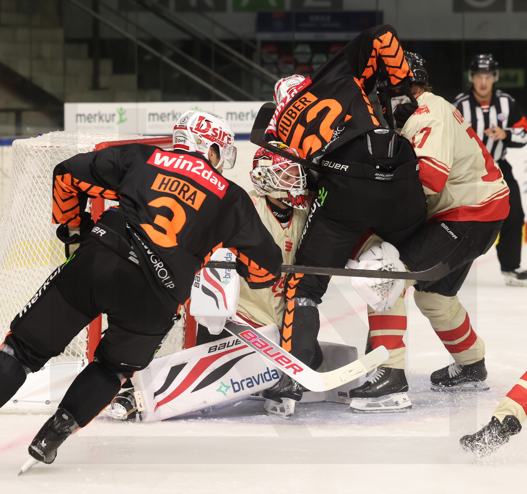 GRAZ, AUSTRIA, 23, Aug, 2025, Moser Medical Graz 99ers vs. Malmö Redhawks. Image shows Frank HORA #3 (Moser Medical Graz 99ers), Daniel MARMENLIND #72 (Malmö Redhawks), Paul HUBER #52 (Moser Medical Graz 99ers) & Johan IVARSSON #17 (Malmö Redhawks). Photo: Werner Krainbucher