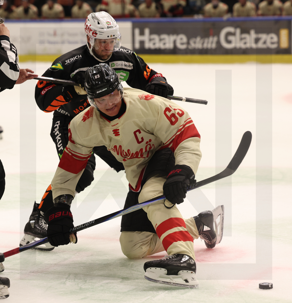 GRAZ, AUSTRIA, 23, Aug, 2025, Moser Medical Graz 99ers vs. Malmö Redhawks. Image shows Josh CURRIE #64 (Moser Medical Graz 99ers) & Fredrik HÄNDEMARK #63 (Malmö Redhawks). Photo: Werner Krainbucher
