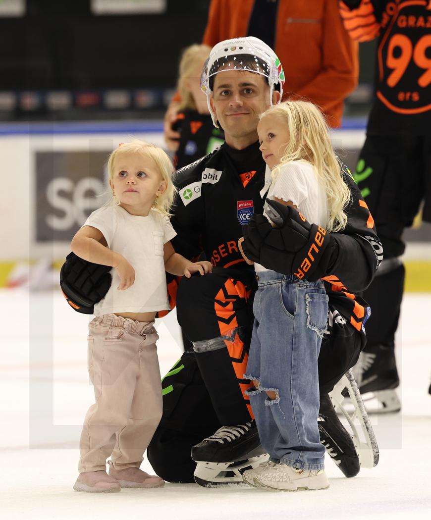 GRAZ, AUSTRIA, 23, Aug, 2025, Moser Medical Graz 99ers vs. Malmö Redhawks. Image shows Nick BAILEN #7 (Moser Medical Graz 99ers) with his kids. Photo: Werner Krainbucher