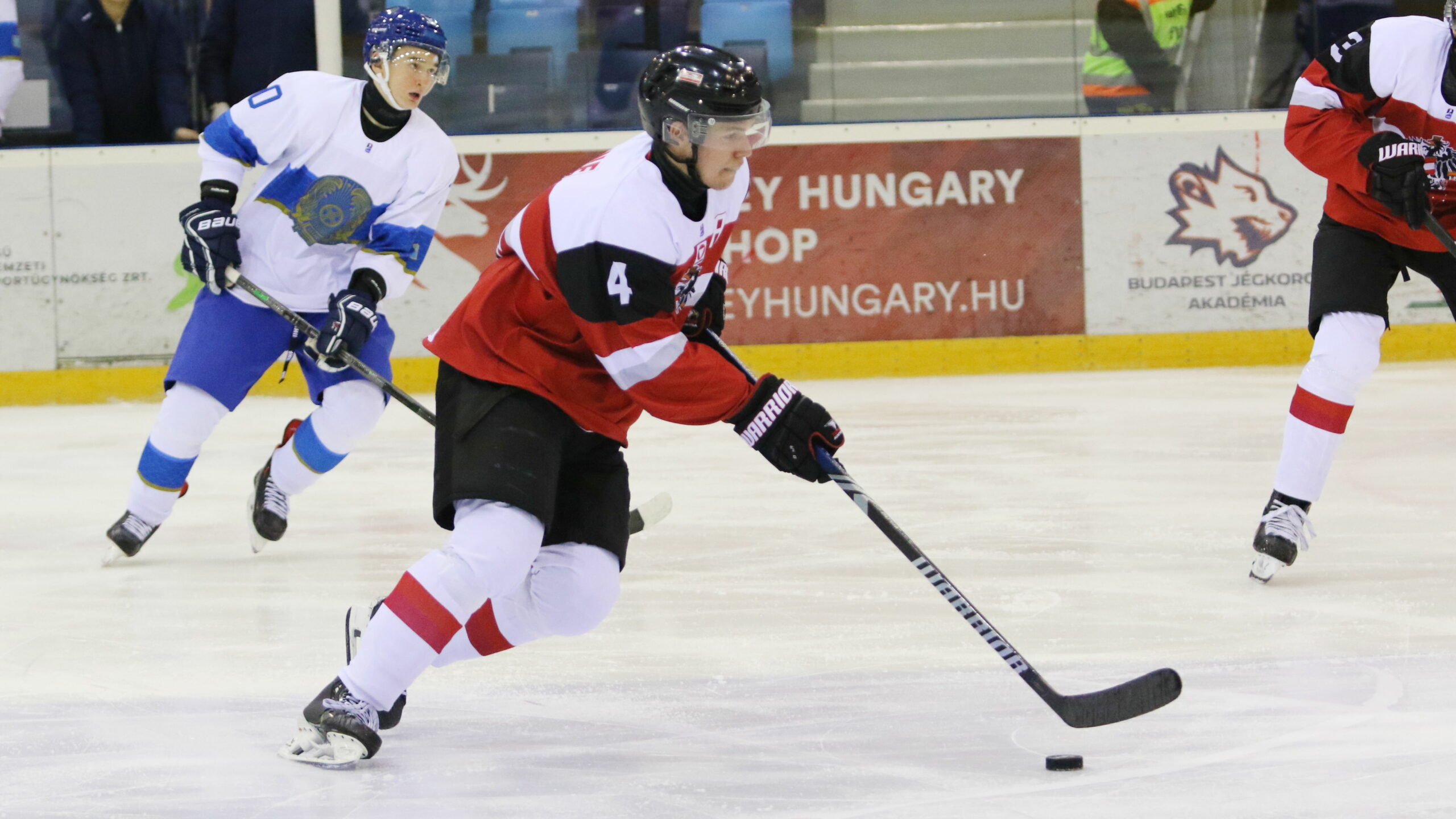 6T4A0315 16. Dezember 2023 2560 × 1440 Österreich gewinnt zum Abschluss gegen Kasachstan U20 IIHF World Championship Div 1A AUT – KAZ Adil Beisembayev #10, Luca Erne #4 Tuskecsarnok Arena, Budapest, © Puckfans.at / Andreas Robanser