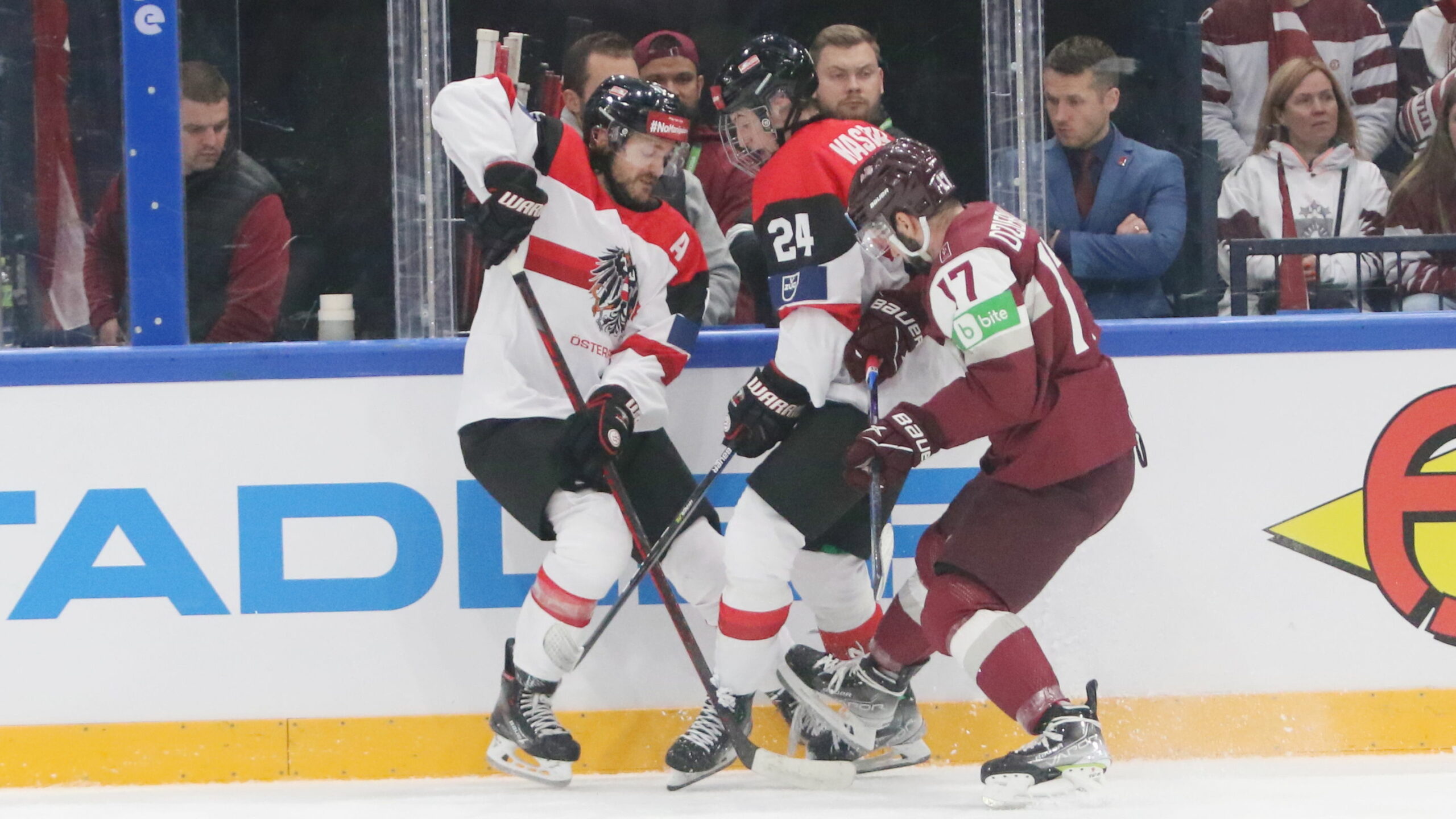 6T4A9047 20. Mai 2022 2560 × 1440 Österreich hat erst am Montag Gewissheit IIHF Ice Hockey World Championship 2022, LAT – AUT Marco Kasper #24, Martins Dzierkals #17 Nokia Arena, Tampere © Puckfans.at/Andreas Robanser