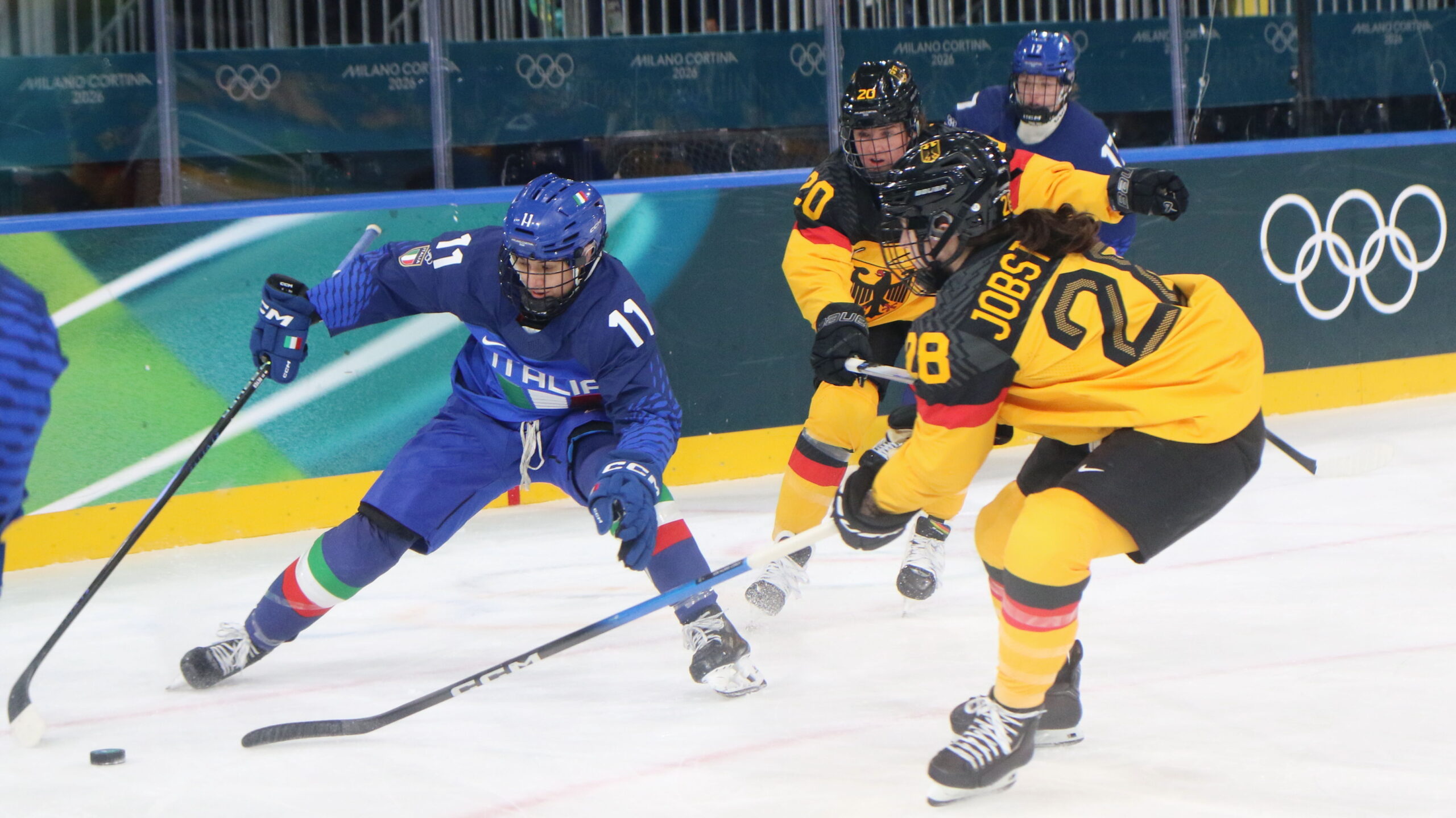 a6T4A6150 10. Februar 2026 2560 × 1440 Offenes Spiel geht an Deutschland Justine Reyes #11, Daria Gleißner #20, Nina Jobst-Smith #28, Olympic Games 2026 Womens Hockey ITA – GER, Milano Rho Ice Park, © Puckfans.at / Andreas Robanser