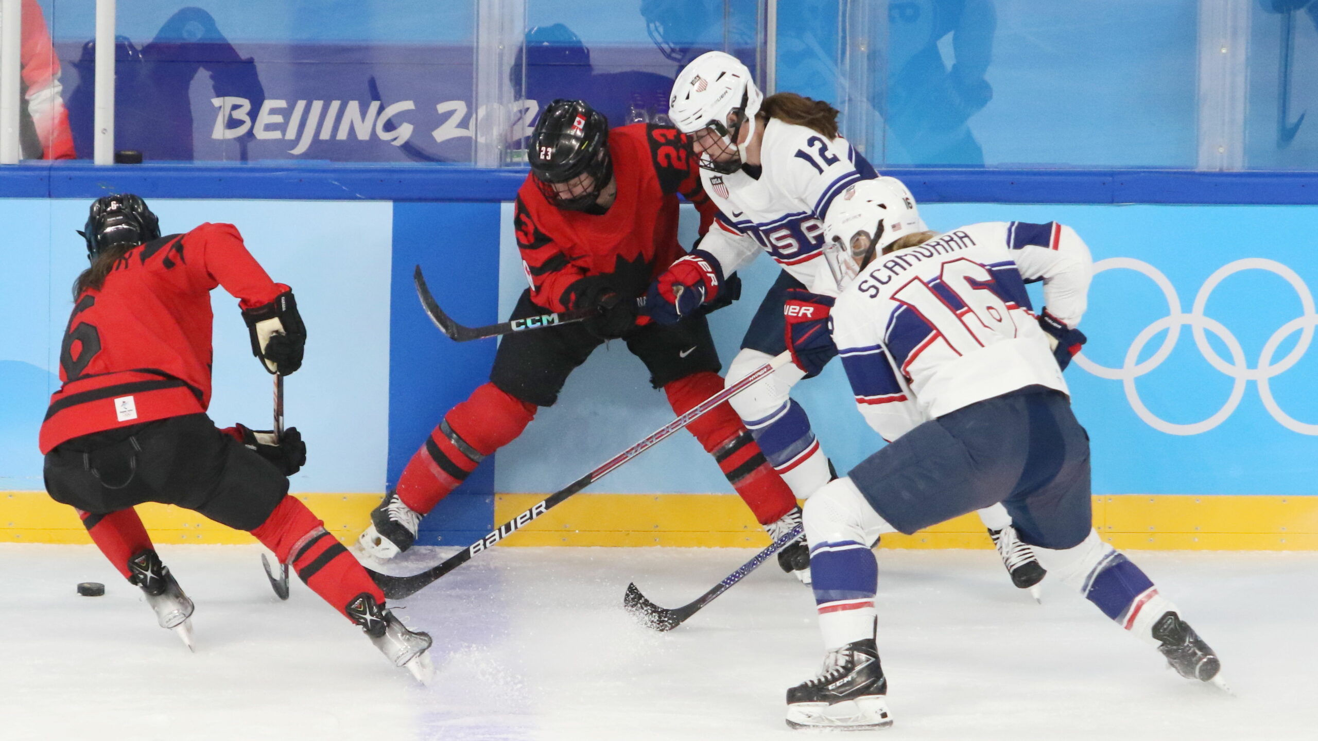 Rebecca Johnston #6, Erin Ambrose #23, Kelly Pannek #12, Hayley Scamurra #16