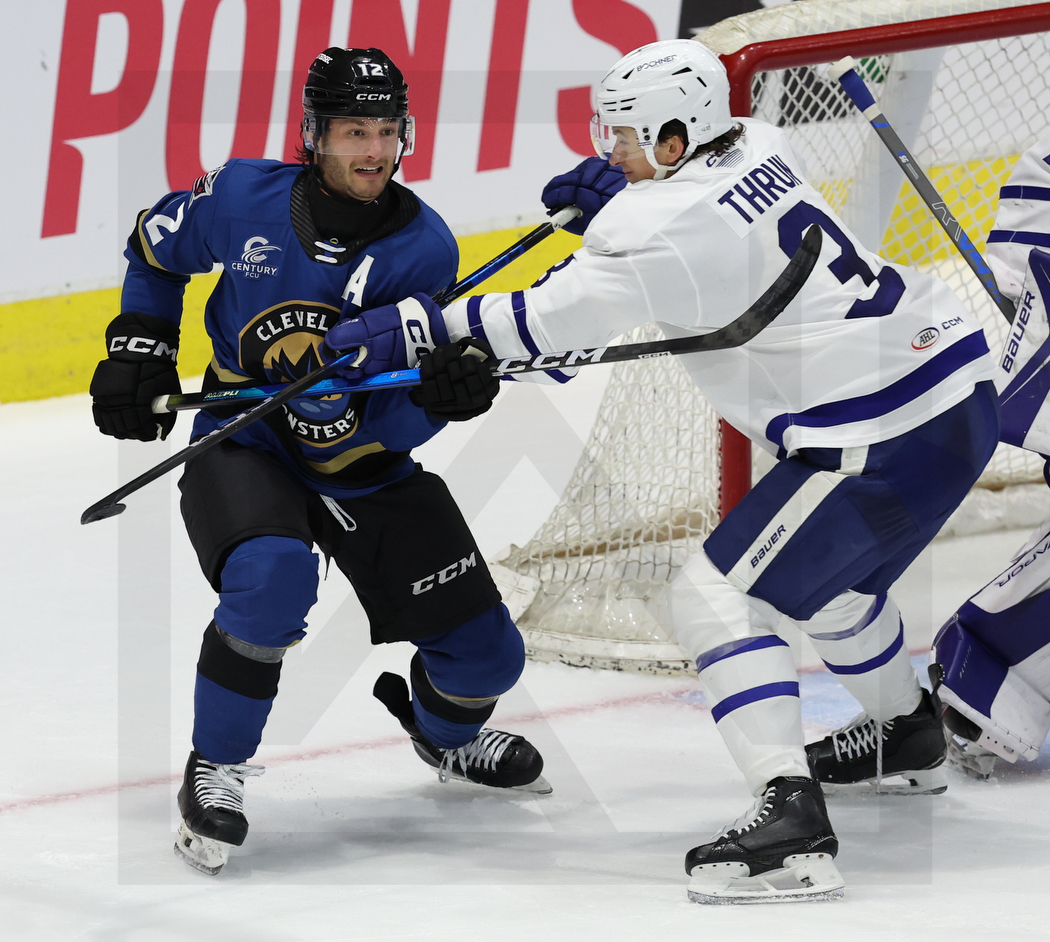 TORONTO, CANADA, 07, Jan, 2026, AHL, Toronto Marlies vs. Cleveland Monsters. Image shows Owen SILLINGER #12 (Cleveland Monsters) & Henry THRUN #3 (Toronto Marlies). Photo: Werner Krainbucher