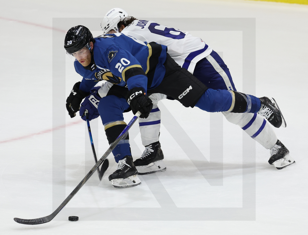 TORONTO, CANADA, 07, Jan, 2026, AHL, Toronto Marlies vs. Cleveland Monsters. Image shows Hudson FASCHING #20 (Cleveland Monsters) & Reese JOHNSON #65 (Toronto Marlies). Photo: Werner Krainbucher