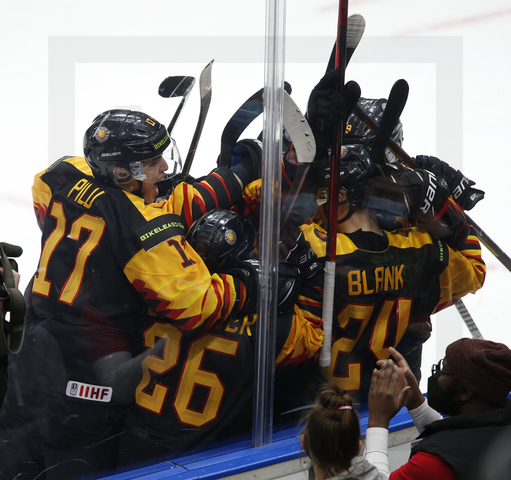 EDMONTON, CANADA, 27.Dec. 2021 – GER vs. CZE. Image shows Germans celebrating their game winning goal from Alexander BLANK #24 (Germany). Photo: Werner Krainbucher