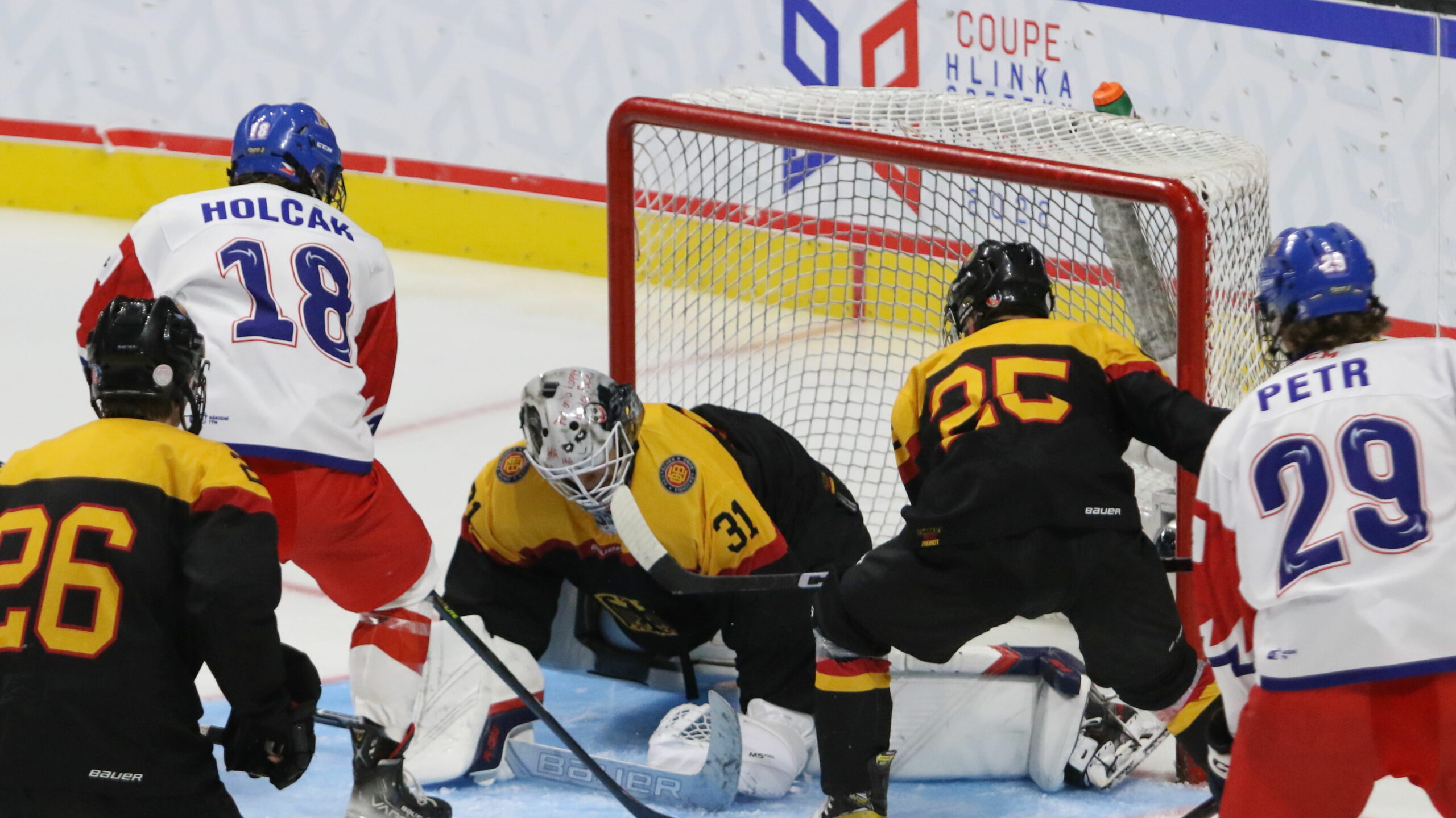 6T4A6374 2. August 2022 2560 × 1440 Photo Gallery Hlinka Gretzky Cup 2022 GER – CZE 2:7 Hlinka Gretzky Cup 2022 GER – CZE Lars Bosecker #26, Tomáš Holčák #18, Dean Doge #31, Florian Renner #25, Dominik Petr #29 Peavey Mart Centrium, Red Deer © Puckfans.at/Andreas Robanser