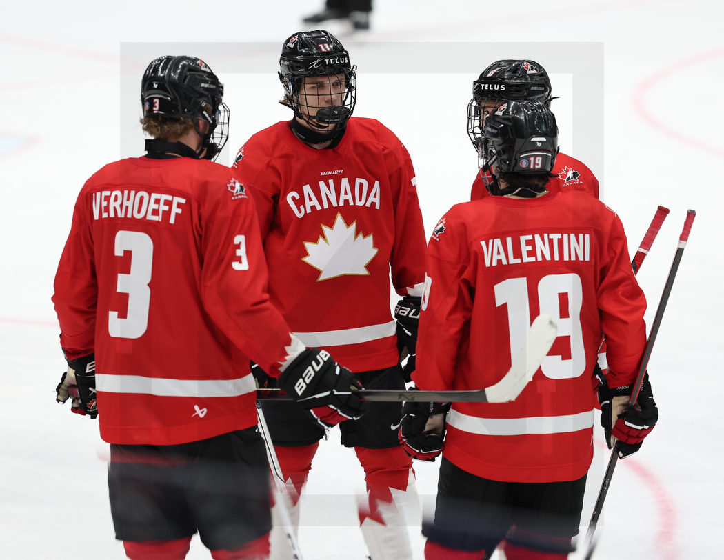 BRNO, CZECH REPUBLIC, 13, Aug, 2025, Hlinka Gretzky Cup, CZE vs. CAN. Image shows Keaton VERHOEFF #3 (Canada), Tynan LAWRENCE #11 (Canada), Landon DUPONT #9 (Canada) & Adam VALENTINI #19 (Canada). Photo: Werner Krainbucher (Puckfans.at)