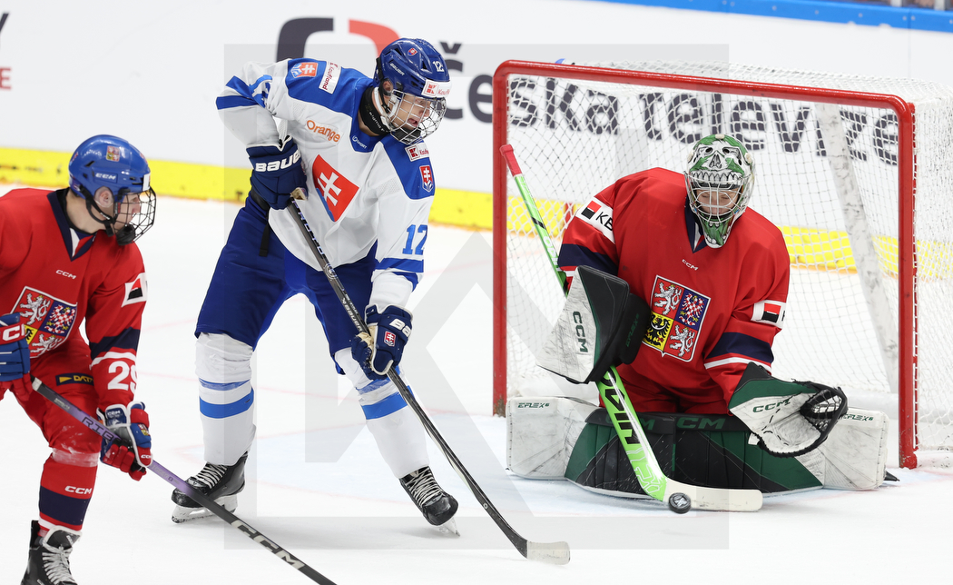 BRNO, CZECH REPUBLIC, 15, Aug, 2025, Hlinka Gretzky Cup, CZE vs. SVK . Image shows Dominick Radim BYRTUS #29 (Czech Republic), Michal PLANCAR #12 (Slovakia) & Marek SKLENICKA #2 (Czech Republic). Photo: Werner Krainbucher