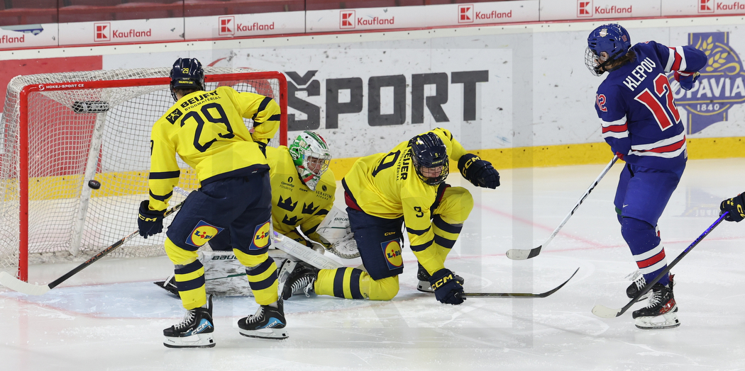 TRENCIN, SLOVAKIA, 16, Aug, 2025, Hlinka Gretzky Cup, USA vs. SWE. Image shows Olle KARLSSON #29 (Sweden), Milo TJÄRNLUND #1 (Sweden), Theodor KNIGHTS #9 (Sweden) & Nikita KLEPOV #12 (USA). Photo: Werner Krainbucher (Puckfans.at)