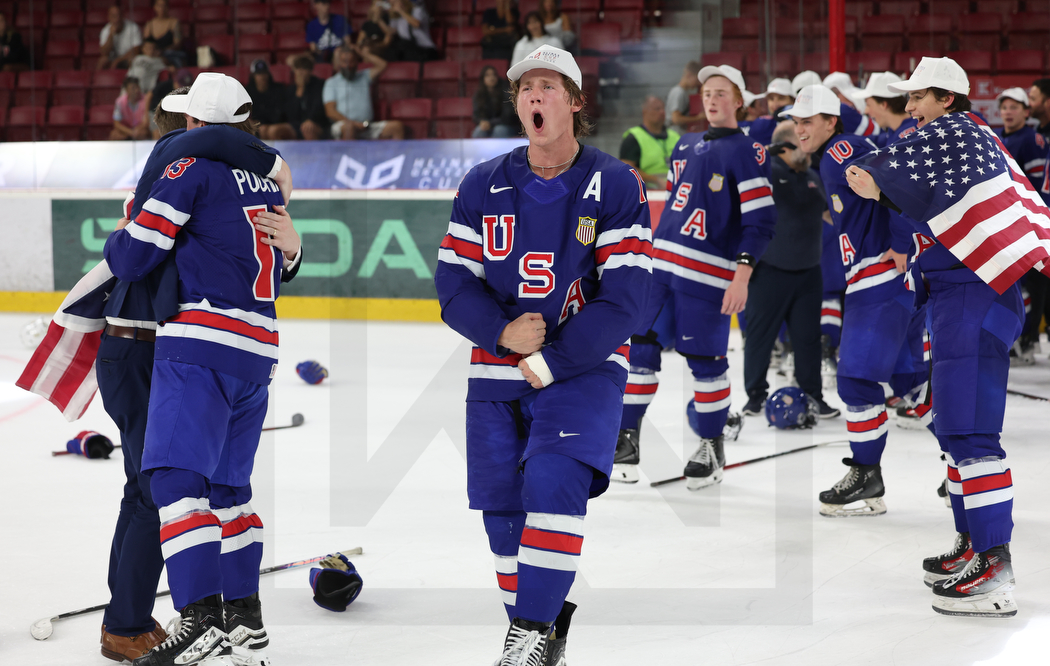 WK20250816_1410 16. August 2025 1050 × 666 PHOTO GALLERY HLINKA GRETZKY CUP 2025, Finale SWE – USA 3:5 TRENCIN, SLOVAKIA, 16, Aug, 2025, Hlinka Gretzky Cup, USA vs. SWE. Image shows winning celebration Team USA. Photo: Werner Krainbucher (Puckfans.at)