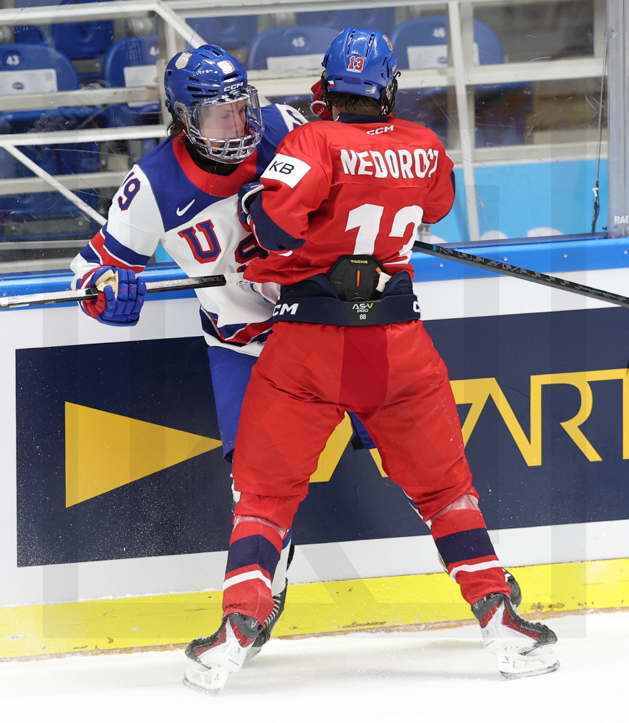 BRNO, CZECH REPUBLIC, 09, Aug, 2025, Hlinka Gretzky Cup, CZE vs. USA. Image shows Shaeffer GORDON-CARROLL #19 (USA) & Vaclav NEDOROST #13 (Czech Republic). Photo: Werner Krainbucher