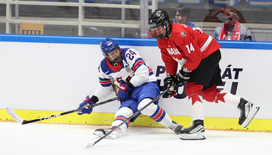 WK20250815_1467 15. August 2025 1050 × 600 PHOTO GALLERY HLINKA GRETZKY CUP 2025, SEMIFINAL CAN – USA 3:4 SO BRNO, CZECH REPUBLIC, 15, Aug, 2025, Hlinka Gretzky Cup, CAN vs. USA. Image shows Kalder VARGA #24 (USA) & Mathis PRESTON #14 (Canada). Photo: Werner Krainbucher (Puckfans.at)