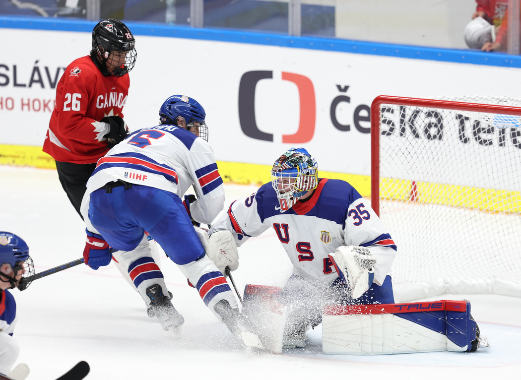 WK20250815_2047 15. August 2025 1050 × 766 PHOTO GALLERY HLINKA GRETZKY CUP 2025, SEMIFINAL CAN – USA 3:4 SO BRNO, CZECH REPUBLIC, 15, Aug, 2025, Hlinka Gretzky Cup, CAN vs. USA. Image shows Markus RUCK #26 (Canada), Alofa Tunoa TA’AMU #5 (USA) & Brady KNOWLING #35 (USA). Photo: Werner Krainbucher (Puckfans.at)