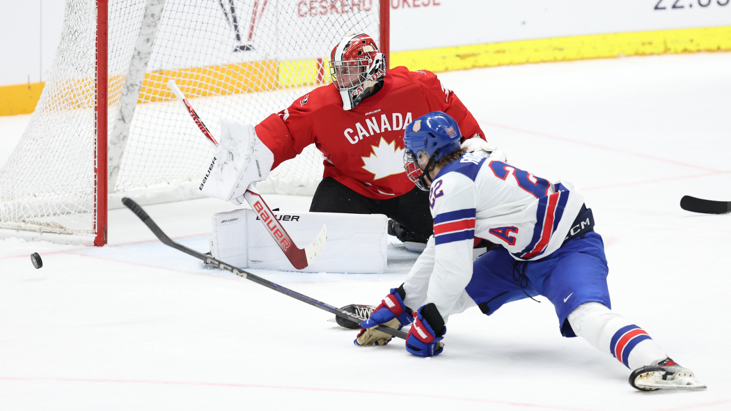 WK20250815_2179 15. August 2025 1050 × 590 PHOTO GALLERY HLINKA GRETZKY CUP 2025, SEMIFINAL CAN – USA 3:4 SO BRNO, CZECH REPUBLIC, 15, Aug, 2025, Hlinka Gretzky Cup, CAN vs. USA. Image shows Gavin BETTS #31 (Canada) & Brooks ROGOWSKI #22 (USA). Photo: Werner Krainbucher (Puckfans.at)