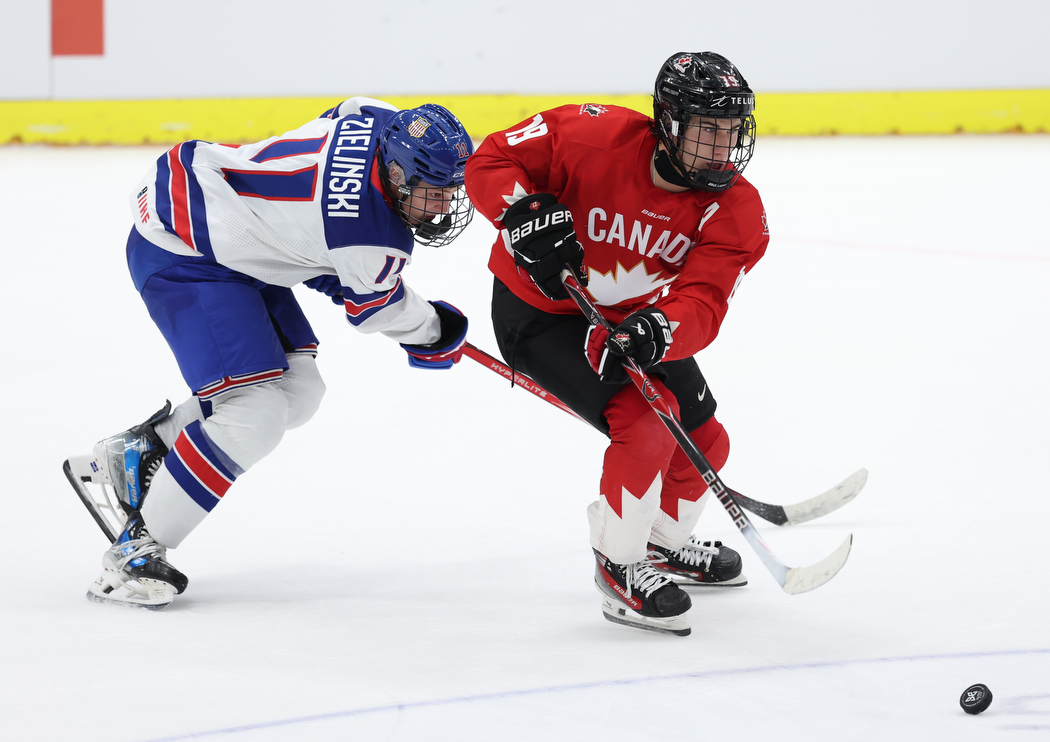 BRNO, CZECH REPUBLIC, 15, Aug, 2025, Hlinka Gretzky Cup, CAN vs. USA. Image shows Blake ZIELINSKI #11 (USA) & Adam VALENTINI #19 (Canada). Photo: Werner Krainbucher (Puckfans.at)