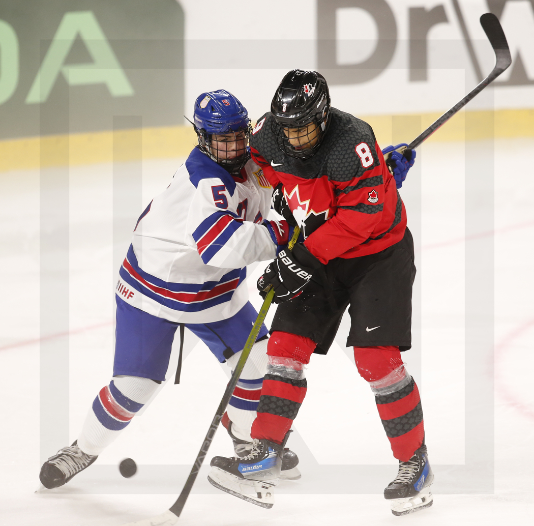TRENCIN, SLOVAKIA, Pavol Demitra Ice Stadium, 04.Aug. 2023 – Semifinal, CAN vs. USA. Image shows Alex BALES #5 (USA) & Malcolm SPENCE #8 (Canada). Photo: © Werner Krainbucher