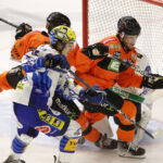 GRAZ, AUSTRIA, 28.Oct. 2022 – Moser Medical Graz 99ers vs. EC iDM Wärmepumpen VSV. Image shows Sam ANTONITSCH #76 (Moser Medical Graz 99ers), Michael SCHIECHL #13 (Moser Medical Graz 99ers) & Kevin MODERER #74 (EC iDM Wärmepumpen VSV). Photo: Werner Krainbucher