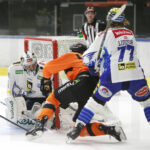 GRAZ, AUSTRIA, 28.Oct. 2022 – Moser Medical Graz 99ers vs. EC iDM Wärmepumpen VSV. Image shows Jean Philippe LAMOUREUX #1 (EC iDM Wärmepumpen VSV), Daniel WOGER #51 (Moser Medical Graz 99ers) & Philipp LINDNER #77 (EC iDM Wärmepumpen VSV). Photo: Werner Krainbucher