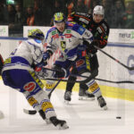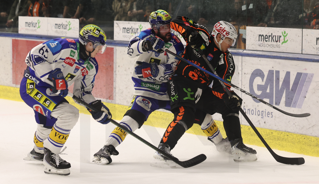 GRAZ, AUSTRIA, 10, Mar, 2026, Moser Medical Graz 99ers vs. EC iDM Wärmepumpen VSV. Image shows Brett BUDGELL #12 (EC iDM Wärmepumpen VSV), Frank HORA #3 (Moser Medical Graz 99ers) & Maxime LEGACE #33 (Moser Medical Graz 99ers). Photo: Werner Krainbucher