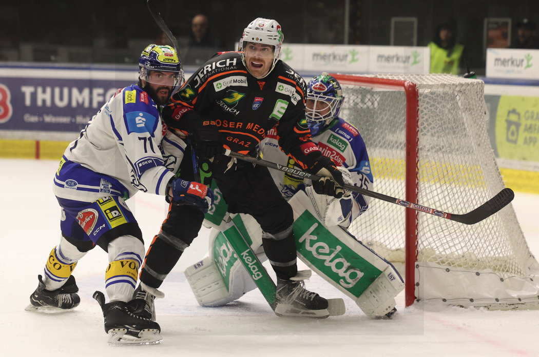 GRAZ, AUSTRIA, 10, Mar, 2026, Moser Medical Graz 99ers vs. EC iDM Wärmepumpen VSV. Image shows Steven STRONG #71 (EC iDM Wärmepumpen VSV), Chris COLLINS #10 (Moser Medical Graz 99ers) & Joe CANNATA #35 (EC iDM Wärmepumpen VSV). Photo: Werner Krainbucher