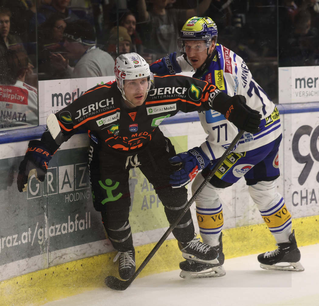 GRAZ, AUSTRIA, 14, Mar, 2026, Moser Medical Graz 99ers vs. EC iDM Wärmepumpen VSV. Image shows Nick SWANEY #55 (Moser Medical Graz 99ers) & Philipp LINDNER #77 (EC iDM Wärmepumpen VSV). Photo: Werner Krainbucher