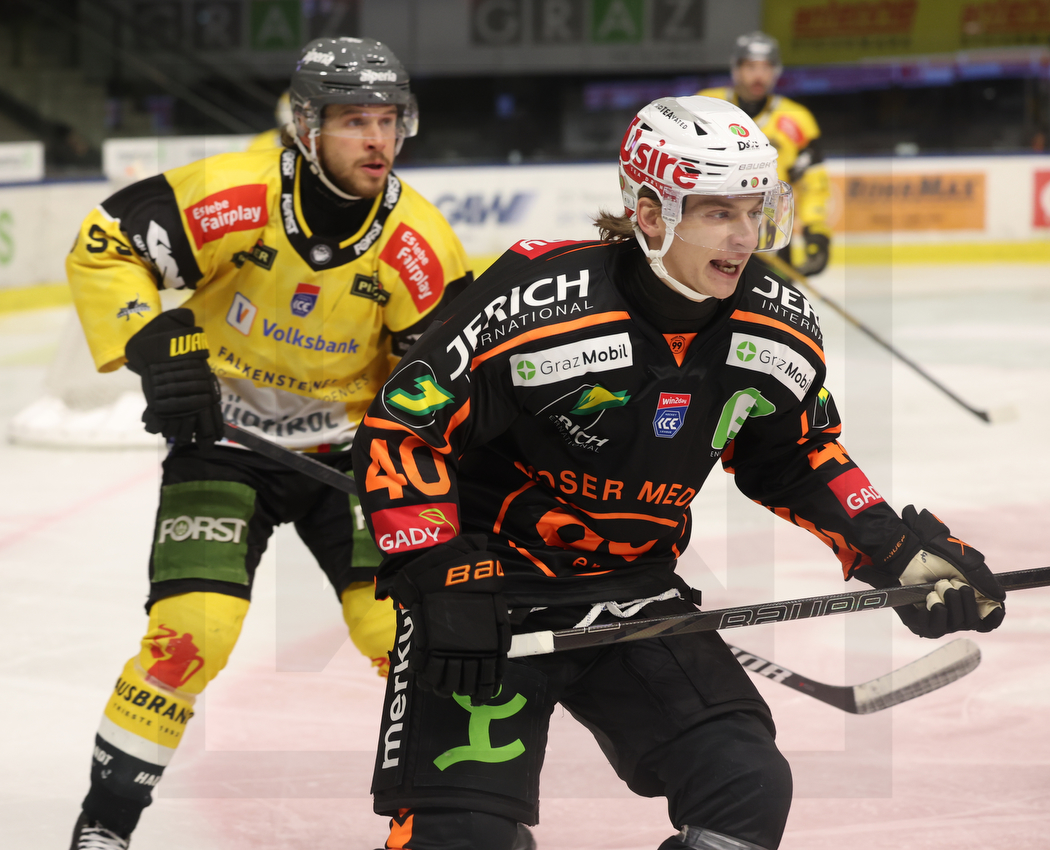 GRAZ, AUSTRIA, 29, Oct, 2025, Moser Medical Graz 99ers vs. HC Falkensteiner Pustertal. Image shows Luca ZANATTA #55 (HC Falkensteiner Pustertal) & Tim HARNISCH #40 (Moser Medical Graz 99ers). Photo: Werner Krainbucher