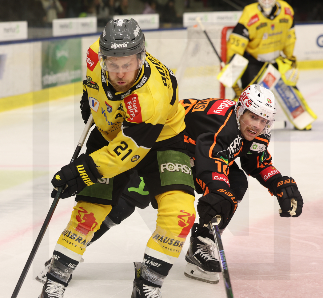 WK20251029_0470 29. Oktober 2025 1050 × 970 PHOTO GALLERY ICEHL ROUND 15 GRAZ 99ERS VS. PUSTERTAL 1:4 GRAZ, AUSTRIA, 29, Oct, 2025, Moser Medical Graz 99ers vs. HC Falkensteiner Pustertal. Image shows Daniel GLIRA #21 (HC Falkensteiner Pustertal) & Chris COLLINS #10 (Moser Medical Graz 99ers). Photo: Werner Krainbucher