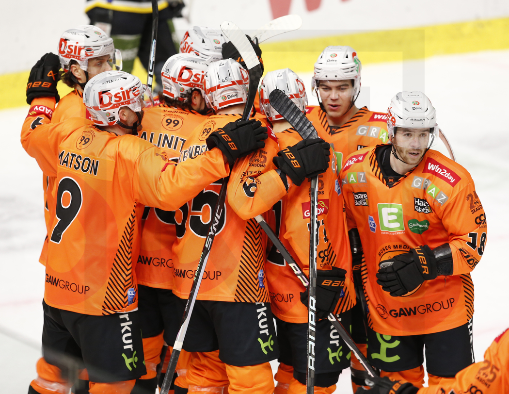 WK20231101_0655 1. November 2023 1050 × 812 PHOTO GALLERY ICEHL ROUND 17 GRAZ 99ERS – HC PUSTERTAL 3:2 OT GRAZ, AUSTRIA, 01.Nov. 2023 – Moser Medical Graz 99ers vs. HC Pustertal Wölfe. Image shows 99ers after their second season win. Photo: Werner Krainbucher