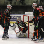 GRAZ, AUSTRIA, 14, Nov, 2025, Moser Medical Graz 99ers vs. EC Red Bull Salzburg. Image shows Kevin ROY #23 (Moser Medical Graz 99ers), Atte TOLVANEN #35 (EC Red Bull Salzburg) & Troy Wayne BOURKE #21 (EC Red Bull Salzburg). Photo: Werner Krainbucher