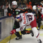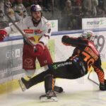 GRAZ, AUSTRIA, 14, Nov, 2025, Moser Medical Graz 99ers vs. EC Red Bull Salzburg. Image shows Connor CORCORAN #8 (EC Red Bull Salzburg) & Jakob LIPPITSCH #70 (Moser Medical Graz 99ers). Photo: Werner Krainbucher